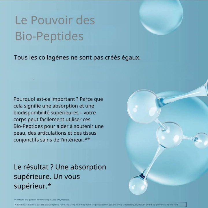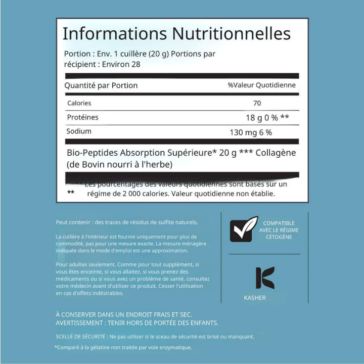 Chaque dose contient 20 g de peptides de collagène et 18 g de protéines pures. Nos biopeptides hydrolysés par voie enzymatique assurent une absorption rapide. Issu de collagène bovin nourri à l'herbe et élevé en pâturage, il est sans agents de remplissage, arômes, édulcorants ni ingrédients artificiels. Il se dissout instantanément dans les boissons chaudes ou froides et enrichit le café, les smoothies et les pâtisseries tout en contribuant à la santé des cheveux, de la peau, des ongles, des articulations et des muscles.